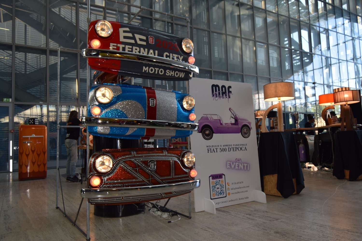 Alla 9ª edizione dell’Eternal City Moto Show 2025 a “La Nuvola” di Roma, MAF4event ha fatto la differenza: mentre il mondo moto esponeva due ruote, noi abbiamo portato l’icona Fiat 500 trasformata in arredi unici, conquistando pubblico e riflettori con uno stile senza eguali.